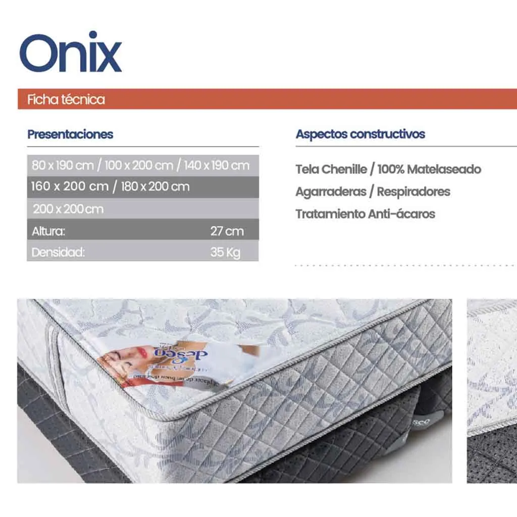 - Densidad: Con una densidad de 35 kg, este Colchon Onix 160x200x27 está diseñado para soportar hasta 130 kg por plaza, garantizando un soporte adecuado para una amplia gama de usuarios.